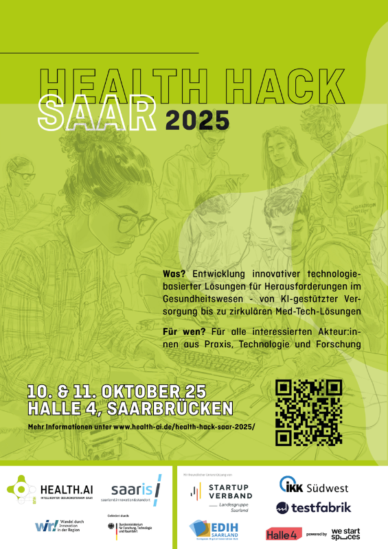 Am 10. und 11. Oktober 2025 findet in der Halle4 in Saarbrücken der Health Hack Saar statt und wir laden dich herzlich ein, dabei zu sein!